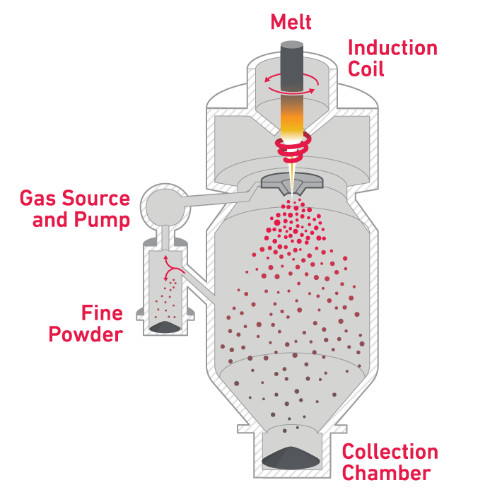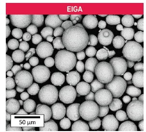 Electrode Inert Gas Atomization (EIGA) continuously melts a pre-alloyed Ti64 rod in an induction coil that falls into a gas nozzle to produce highly spherical powder particles. EIGA powder serves as an alternative to plasma atomized powder, using more economical bar feedstock.