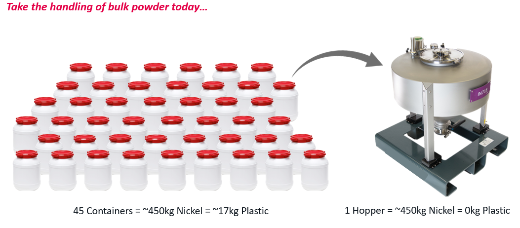 Using ~450kg of Nickel as an example, typically this would fill 45 plastic containers which equated to approximately 17kg of plastic waste. With one hopper, this powder could be stored and transported with 0kg of plastic waste. The environmental damage from plastic has become a huge issue through the years, and at Carpenter Additive, we want to play our part in saving the planet from plastic pollution.